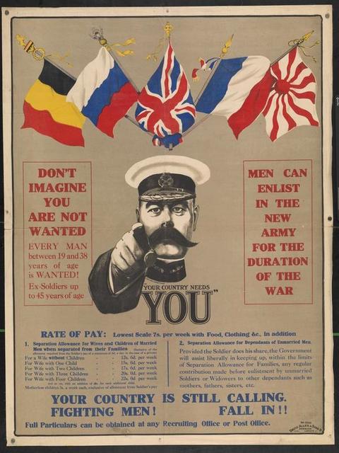 The image and the words 'Your country needs you' appeared on a poster privately printed in November 1914. Both are almost lost among the flags of the allied nations - Belgium, Russia, Great Britain, France and Japan - and information about rates of pay and separation allowances for wives, depending on the number of children they had, and even for the families of unmarried men "within reason", if he "does his share". "Don't imagine that you are not wanted. EVERY MAN between 19 and 38 is WANTED! Ex-soldiers up to 45 years of age."