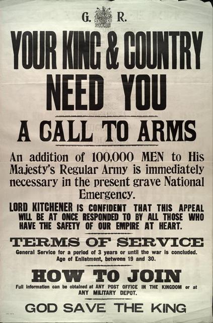 However, none of these were the poster that launched Lord Kitchener's appeal, his 'call to arms' on 11 August. There was no populism in this poster, no image of Kitchener the hero of Khartoum, just the plain facts - in the present grave national emergency YOUR KING & COUNTRY NEED YOU, 100,000 men immediately. The poster gave details of the terms of service and information on how to join. Within ten days Kitchener had his 100,000 men - and immediately launched an appeal for 100,000 more.